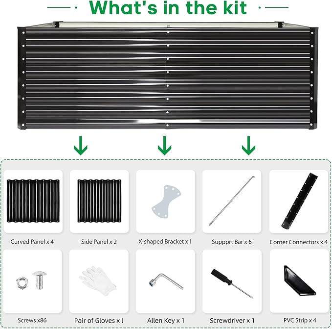 - What You Get: we have included Galvanized raised garden bed kit with detailed assembly instructions, corner protector, support rods ,safety gloves , wrench tools and with galvanized nuts and bolts in the box .These essential tools elevate your overall planting and gardening adventure