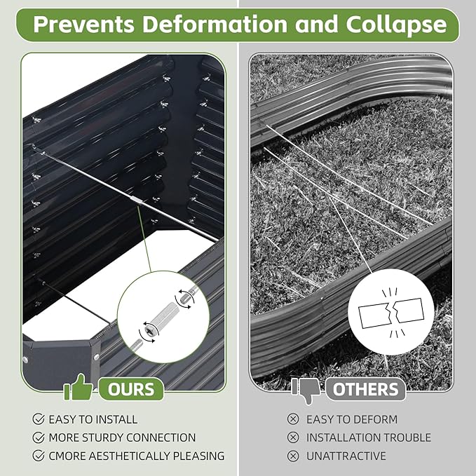 - 【 Superior Durability 】Made of 0.7mm thick zinc-coated steel with spray coating, our raised garden bed resists rust, corrosion, and deformation for 5x longer lifespan than thin competitors. Dual-folded edges ensure galvanized garden bed structural stability even in harsh weather.