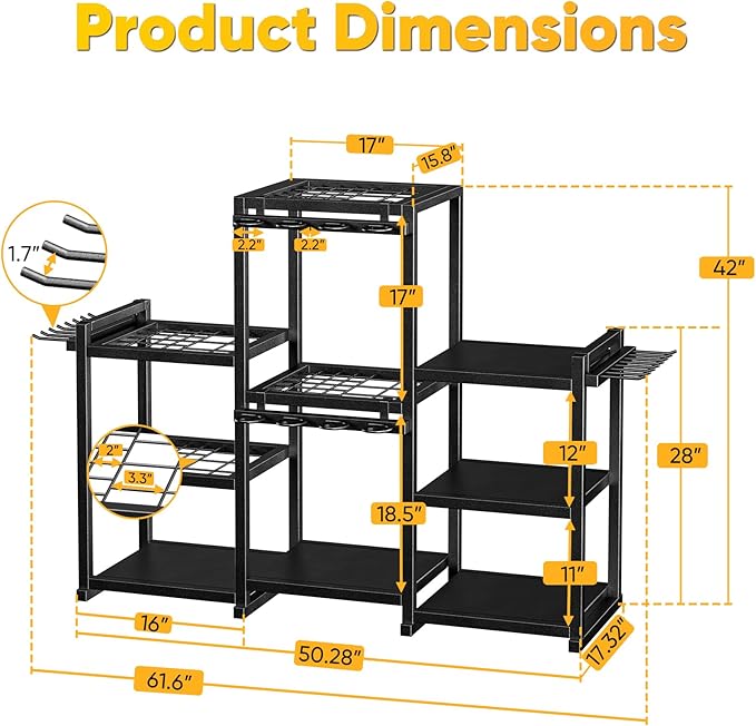 - TAILOR-MADE FOR GARDEN TOOL STORAGE: This garden tool organizer is crafted with precision to fit a wide range of tool sizes, featuring two handle heights (42" & 28") and dual grid slots (2" & 3.3") for different handle thicknesses. With added side and bent hooks, it maximizes your storage space and keeps every garden tool neatly in place.