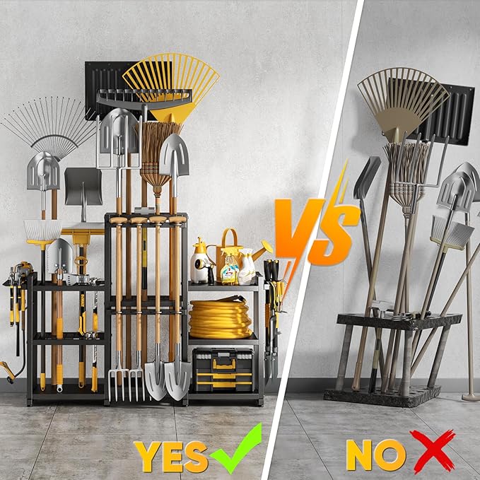 - MULTI-PURPOSE LAWN TOOL ORGANIZER FOR GARAGE: Ideal for garages, sheds, patios, and basements, this lawn tool organizer for garage stores rakes, shovels, brooms, and more. Its versatile design fits multiple spaces and keeps your lawn and garden tools perfectly arranged.