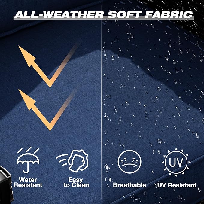- Comfy Thick Cushion: Upgraded cushions are all made of high density sponge with 4 inches, thick sponge seat cushions and soft back cushions gives you comfortable support. The cushion cover is made from olefin fabric, which is breathable, UV-resistant, and waterproof. It features a zipper on the side for easy removal and cleaning