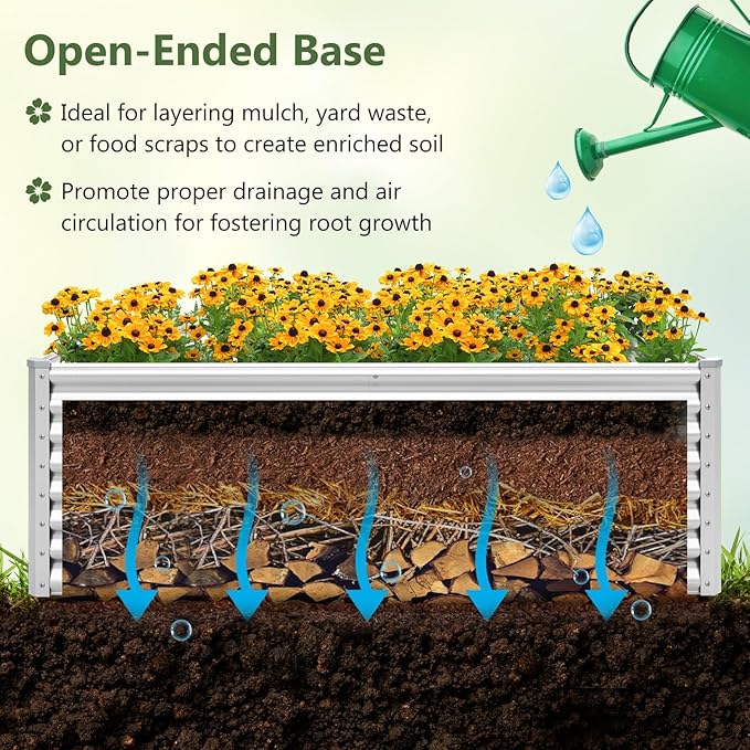 - [Open Base & Safety Guard]: Featuring an open bottom design, this garden bed prevents water buildup and enables roots to easily access nutrients in the soil, promoting unrestricted growth and healthier plants.