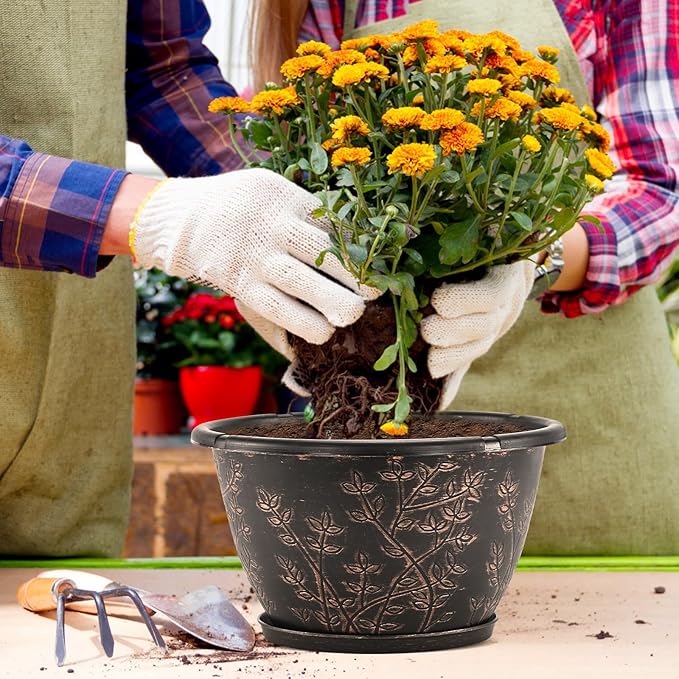 - 【Perfect Size & Retro Style】Top diameter: 12 inch, bottom diameter: 6.5 inch, height: 6.9 inch, capacity: 2 Gallon. 12 inch planters for indoor plant is perfect for planting medium to large sized plants.These flower pots outdoor is designed with climbing vines which is not just drawn on, they are “carved” into the surface. Plastic plant pots have a metal copper etching that is very attractive and add a retro feeling.