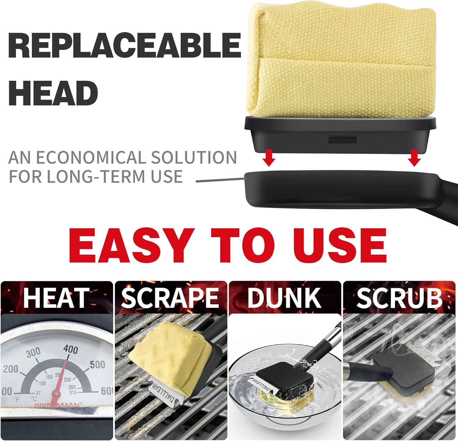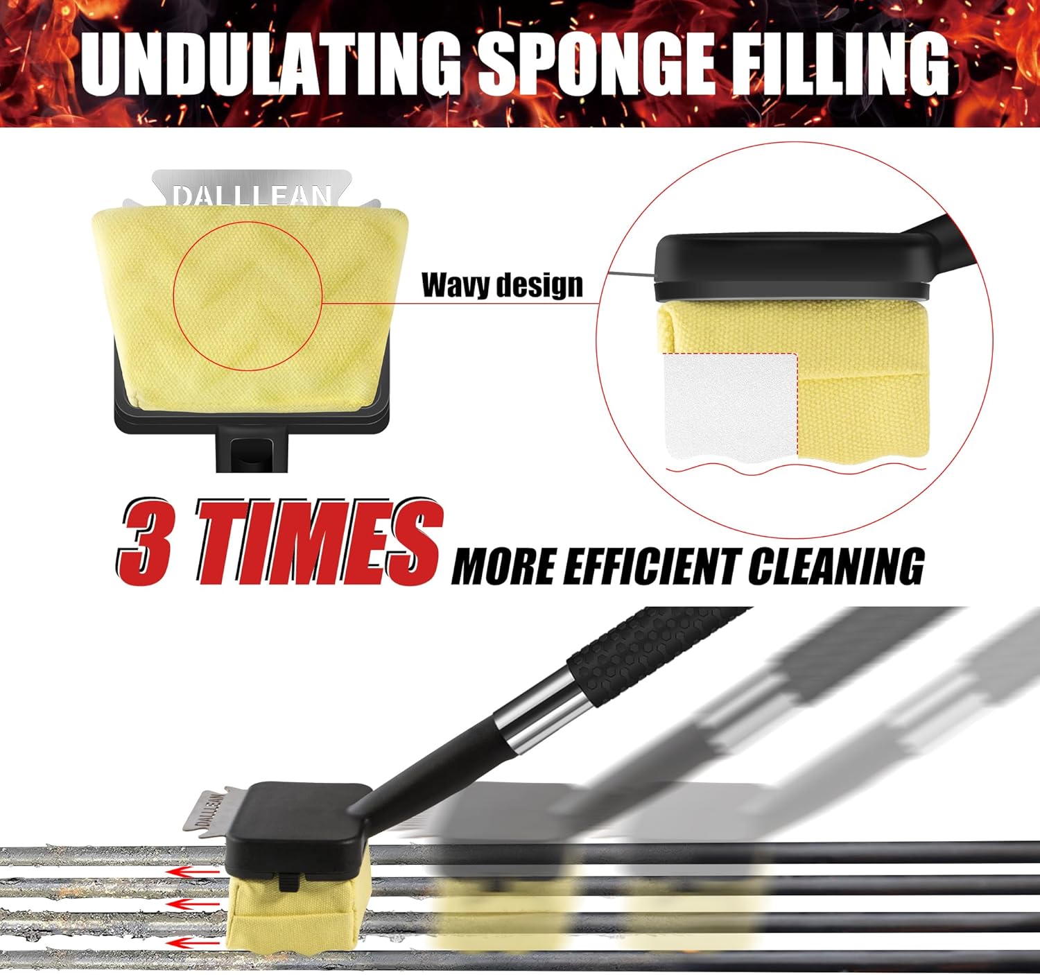 - 【Trapezoid-Shaped Design Sponge Grill Brush Head 】Keep the lovely grill clean and safe with the DALLLEAN bristle-free grill brush. The sponge head is made of heat-resistant foam and wrapped in a high-temp fabric, not same like wire grill brushes, no dangerous metal bristles will end up in the food.