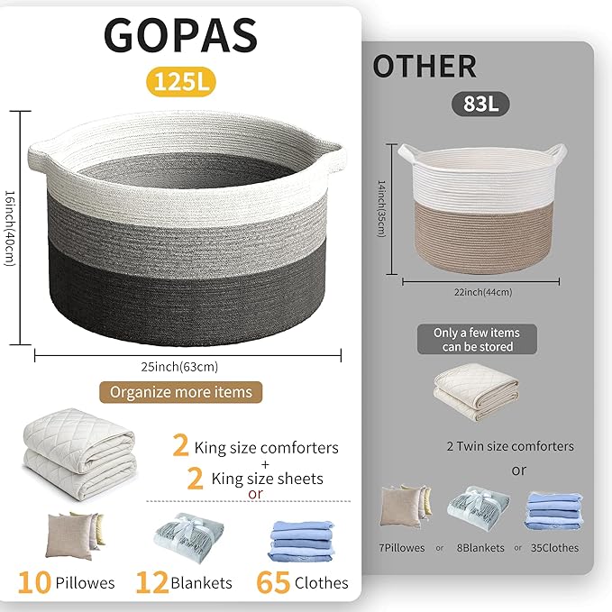 125L Extra Large Blanket Basket, 25" x 16", Jumbo Laundry Woven Baskets Decorative Home, Cotton Rope Basket with Handles, Baby Toy Baskets for Storage, Gradual Gray, 2PC