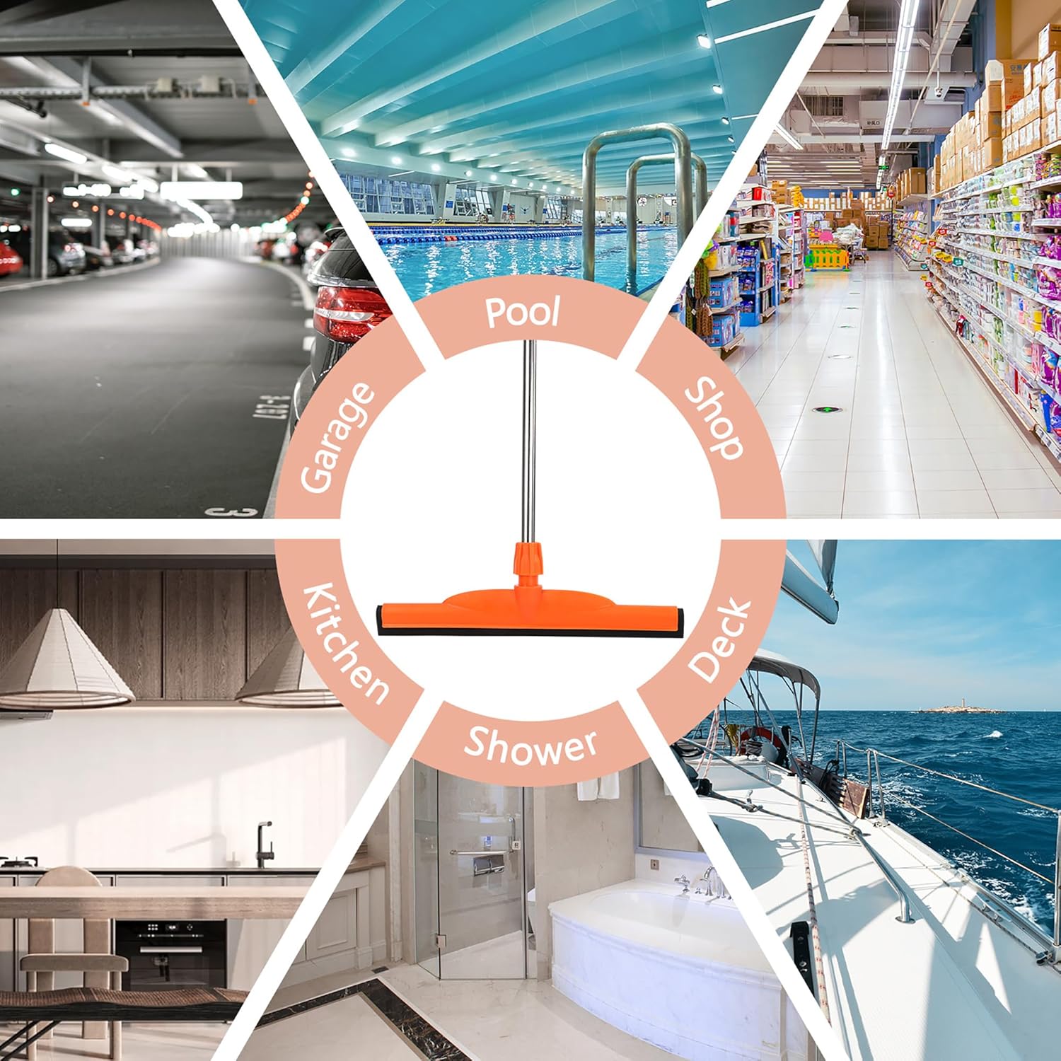 - Floor Squeegee Broom Multipurpose: Floor squeegee scrubber with 51’’ stainless steel pole - versatile cleaning for multiple surfaces, to dry floor surface efficiently and remove dirt and hair easily. Suitable for garage courtyard shower bathroom pet hair fur floor marble glass tile water foam cleaning. Whether you’re dealing with concrete floors, tile floors, shower areas, decks, or commercial spaces like garages, hospitals, hotels, and pools, this floor squeegee handles it all with ease