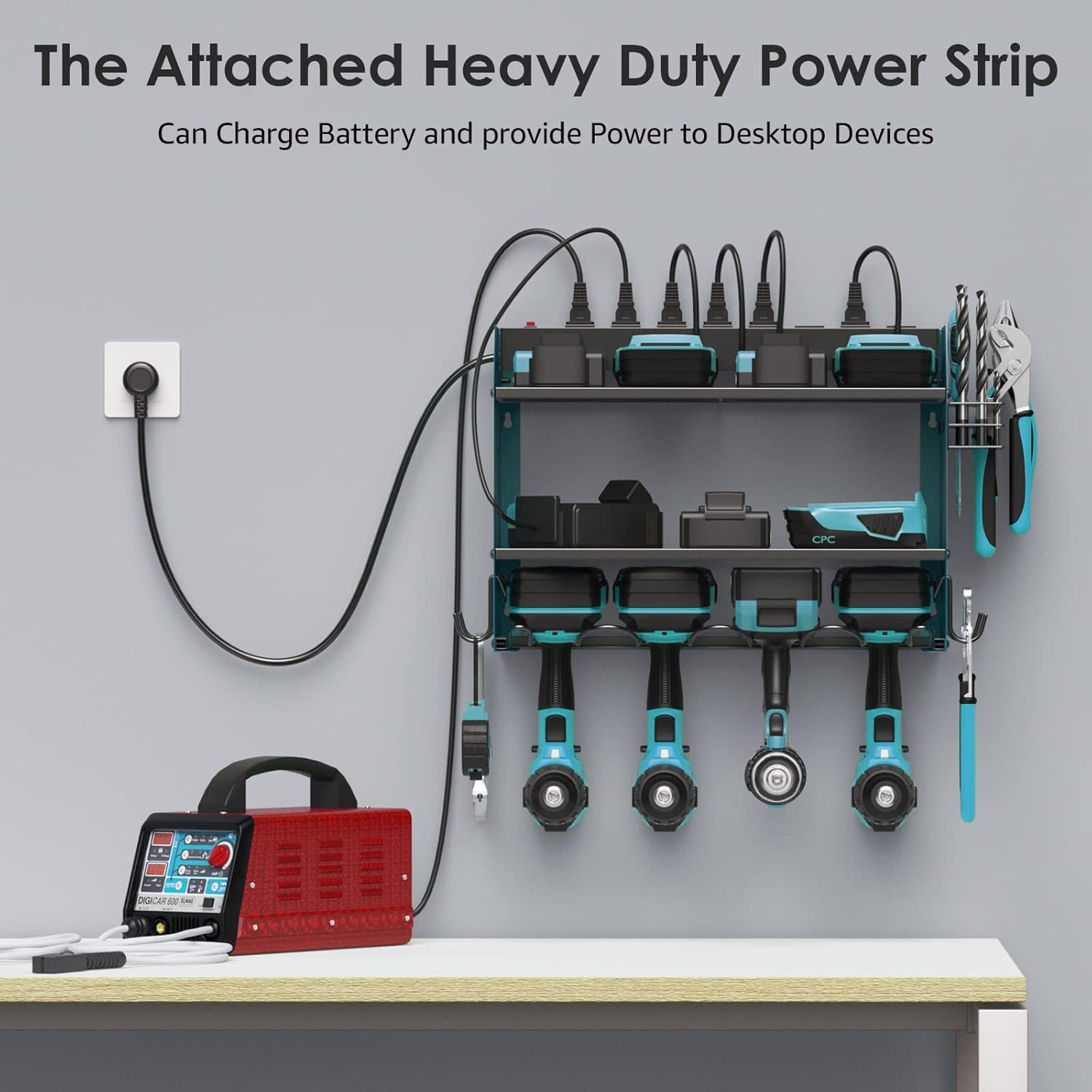 - Wall mount power tools organizer come with 4 slots, 4 hooks and drill bit rack, built-in power strip, double layer structure can keep rechargeable tools organized in the work area and save your bench space. The tools in the picture are for demonstration purposes only and are not included.