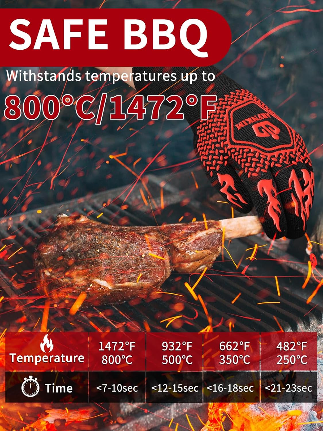 - Unmatched Heat Resistance: Our BBQ oven gloves are designed to 1472°F (800°C) withstand extreme heat, ensuring safe handling of hot grills, pans, and oven trays. Perfect for all your high-temperature cooking needs.