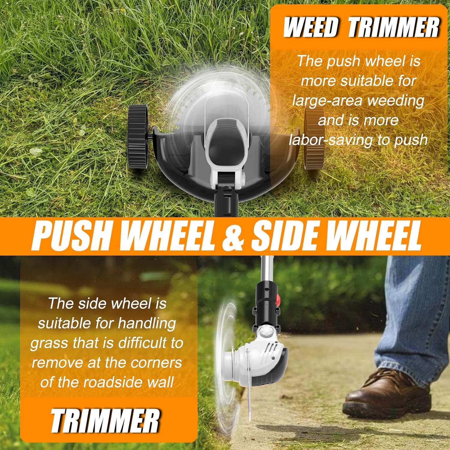 - 【Powerful Cordless Weed Trimmer】 The electric weed wacker cordless with wheels all in one: grass trimmer/ lawn edger/ small mower/ brush cutter. Not limited by power cord, you can use it anywhere. Includes 2 high-capacity rechargeable batteries working time up to 180-240 minutes. Equipped with 900W high-power pure copper motor with no-load speed up to 20,000RPM. it can easily meet all daily cleaning needs. Weeding is no longer a burden and you can enjoy trimming with your family