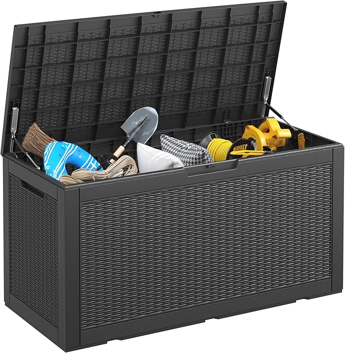 - Stylish design: Featuring a modern pattern design, this all-weather resin deck box adds a touch of elegance to your patio, garden, porch, or poolside. It serves as both a practical storage solution and a beautiful decorative piece.