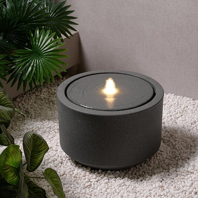 10.23” H Outdoor Water Fountain Made with Eco-Friendly Recyclable Materials, Polyethylene Round Bubbler Outdoor Fountain, Garden Decor with LED Light for Patio, Porch, Backyard