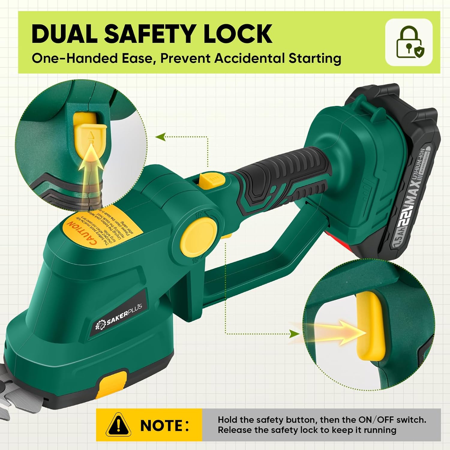 - 【ENHANCED SAFETY SYSTEM】Designed with double safety locks, the SakerPlus cordless hedge trimmer prioritizes user protection. The built-in blade guard and safety switch work together to prevent accidental operation. To start the unit, both the trigger lock and the main trigger must be engaged simultaneously. Blade changes are tool-free—simply press the side buttons to switch between trimming modes quickly and safely.