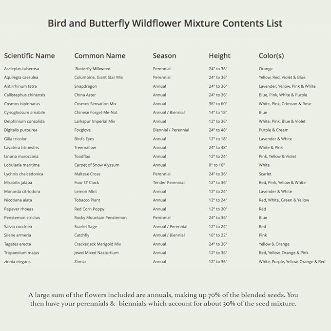 - Perennial Flower Seeds: Our Butterfly Mix contains a few perennial / tender perennial flower seeds, such as butterfly milkweed seeds, giant star columbine seeds, maltese cross seeds, scarlet salvia seeds & four o' clock seeds.