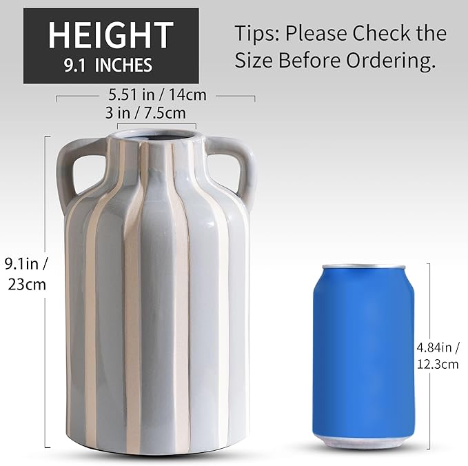 - 【Premium-Scale Craftsmanship】 Crafted from durable ceramic measuring 9.1"x5.9"x5.5", this substantial vase with handle combines functionality with decor impact. The weighted base ensures stability for floral arrangements, while the earthy color palette seamlessly integrates with beige vases for decor living room schemes and modern farmhouse aesthetics.