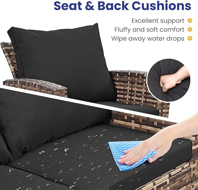 - Oversize Outdoor Patio Furniture Set:FHFO wicker patio furniture set with widened armrests,and curved backrest is ergonomically designed to bring comfort to the back. Wide and deep patio sofa cushioned by soft padded seat cushions will make you forget your fatigue and enjoy your leisure time completely