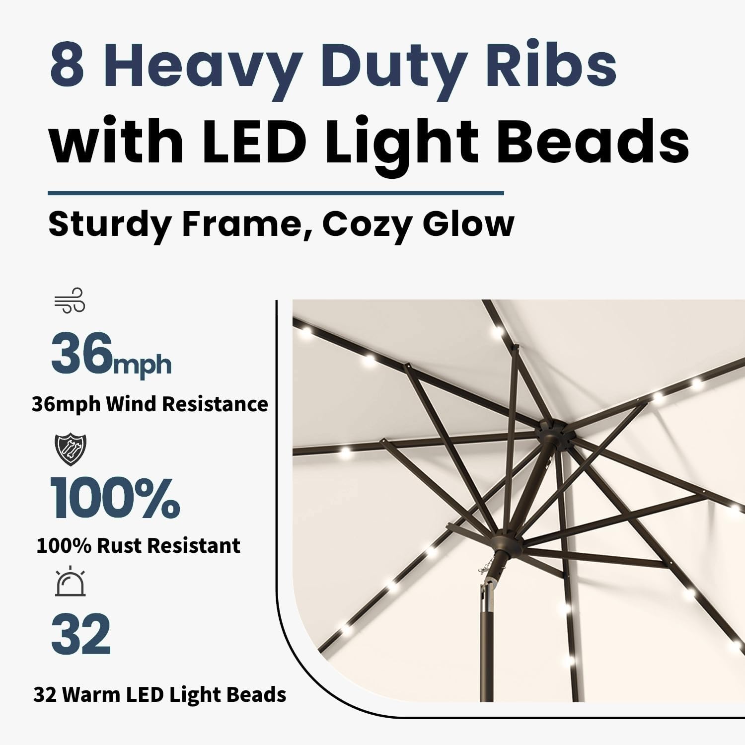 9FT Solar Umbrella 32 LED Lighted Patio Umbrella Table Market Umbrella w/Tilt and Crank, UV-Resistant Outdoor Umbrella for Pool, Garden, Deck, Creamy White
