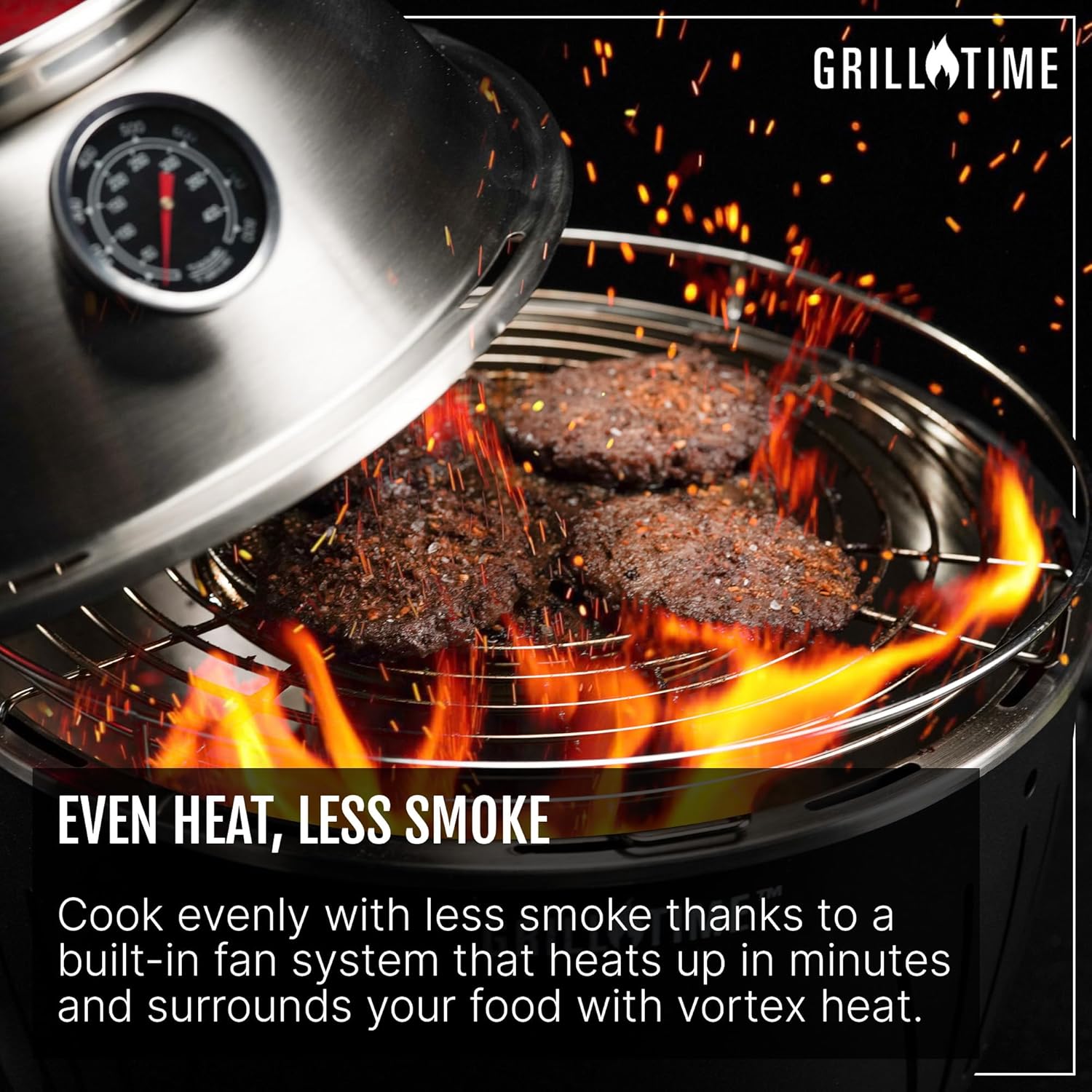 - FAST, EVEN COOKING - A fan-powered airflow system delivers strong, consistent heat with less smoke. Perfect for roasting, smoking meats, or even baking right on your grill.