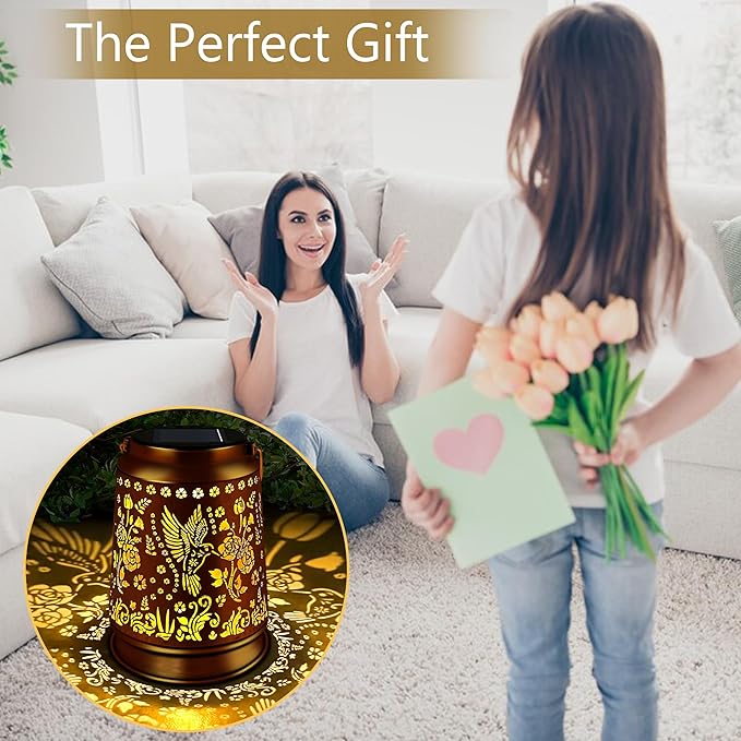- Perfect Decorative Unique Design:This new 2025 solar-powered hummingbirds outdoor lantern features an intricate hummingbird and floral cutout pattern that casts a warm, enchanting glow ,The vintage garden decor Solar Lantern hummingbird outdoor camping waterproof lights retro appearance, with gold copper color and hollow out metal veneer, the solar outdoor lanterns casts bright and warm light in darkness, accompanied by gorgeous and graceful hummingbird patterns, adding a beautiful atmosphere to the surrounding environment.