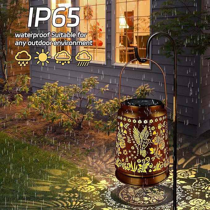 - Durable Lantern Solar Outdoor IP65 Waterproof Construction: Crafted with durable, weather-resistant materials, The lantern can withstand exposure to rain and moisture,Hummingbird lantern outdoor is made of metal which is sturdy and durable, IP65 waterproof rating design, don't worry about rain, solar garden lights can work on rainy days, Solar lantern power supply, no electricity charge, no power cord required, easy to use.