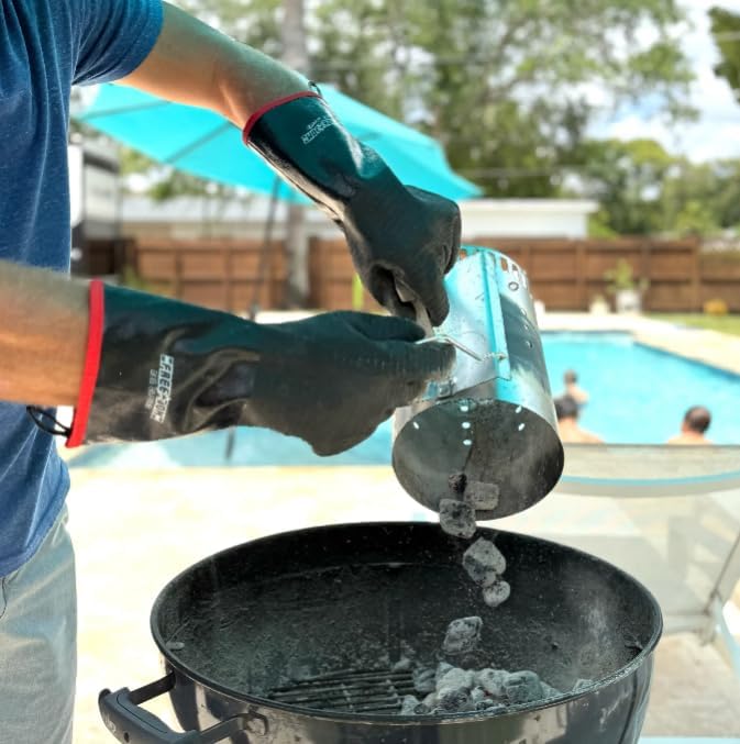 - Extended 18″ Gauntlet Cuffs: Extra-long cuffs guard your wrists and lower arms against burns and splatter. The 14-inch sleeve design provides comprehensive forearm protection when reaching deep into smokers, ovens, or over large grill surfaces. Tackle rotisserie, open-fire, or turkey frying with confidence and no fear of singed arms.
