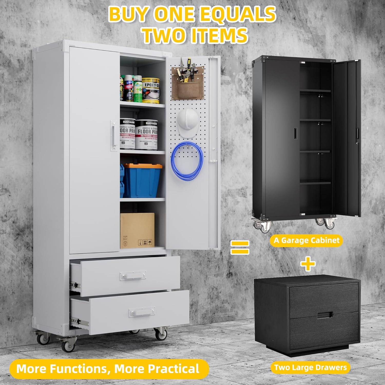 Aobabo 2 Large Drawer Metal Storage Cabinet with Wheels, Lockable Steel Storage Cabinet with 3 Adjustable Shelves with 6 Hooks for Home, Office, Garage, Classroom, White, Assembly Required