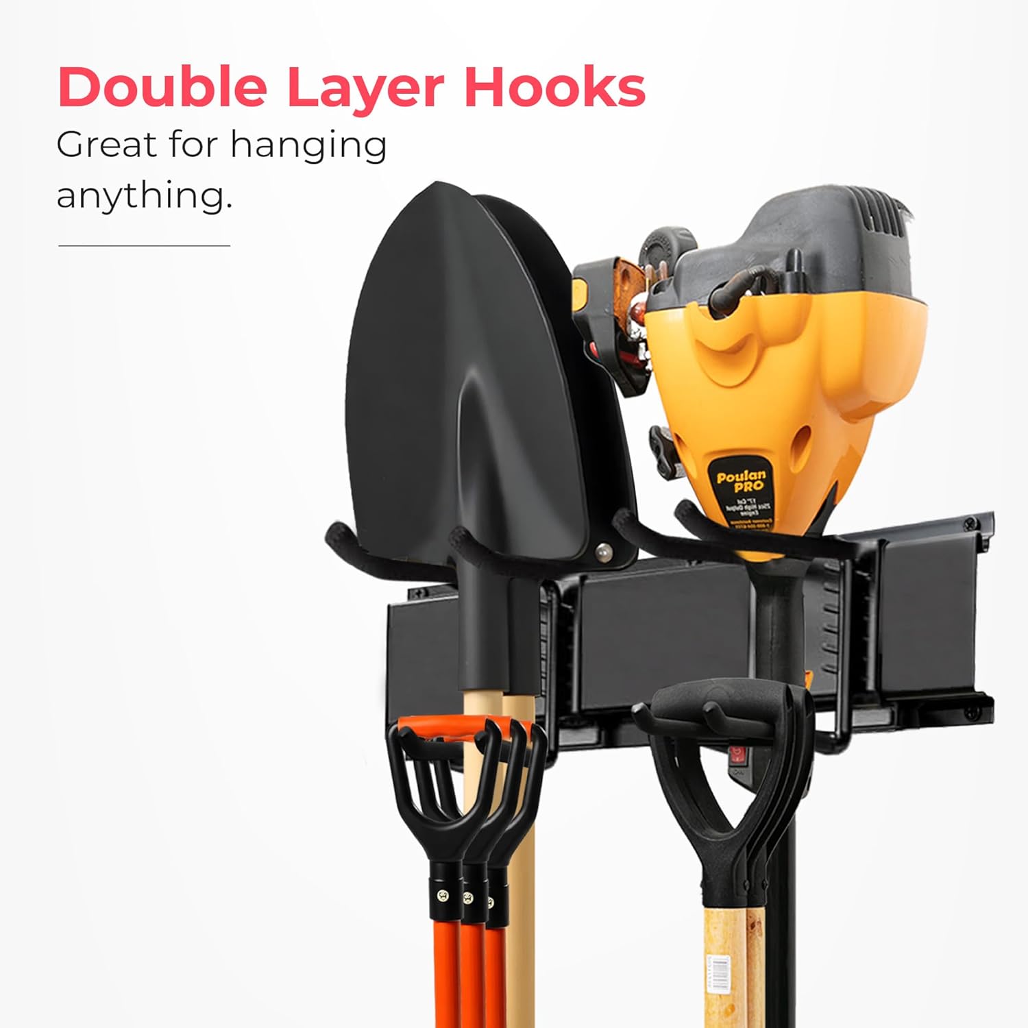 - DOUBLE-LAYER HOOK DESIGN FOR MAXIMUM STORAGE: Elevate your organization game with this innovative double-layer hook system! Perfect for securely holding shovels, rakes, power tools, hoses, and even sports equipment, giving you twice the capacity in the same space.