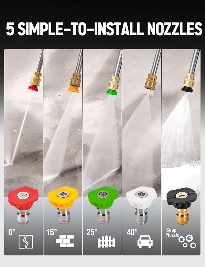 - High-quality and complete accessory set: 35ft High-pressure hose,spark plug sleeve, lever, funnel and needle insertion, 0°, 15°, 25°, 40°, foam nozzle.