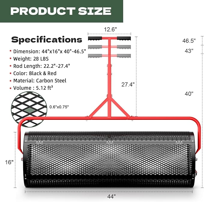 Compost Peat Moss Spreader for Lawn, 44 Inch Compost Roller Spreader with Adjustable T-Shaped Handle, Upgraded Side Clasps, Durable Lightweight Metal Roller, Lawn Garden Yard Care