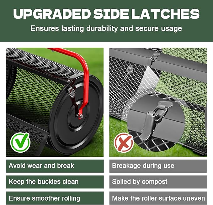 - [Upgraded Side Lock] The Compost Spreader includes an upgraded side-locking mechanism to prevent deformation during operation. A large hinged door simplifies top-up, and this structural upgrade boosts overall durability of this compost spreader for lawn.