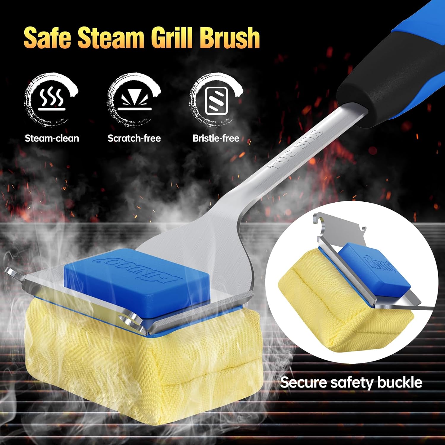- 【Safe Bristle Free Grill Brush】 Unlike traditional wire brushes, our bbq outdoor grill cleaner brush are non metal bristles to damage grill and end up in your food.It uses the power of steam to quickly and easily melt grease, dirt, and food residue. It's safe and efficient.Even can spray it with oil to coat grates for maintenance