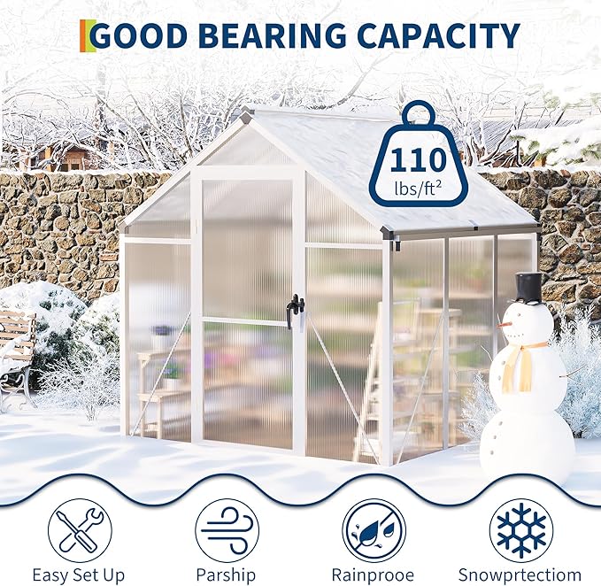 - 【Resilient Construction】Designed to endure challenging weather, our greenhouse features 720g/m² polycarbonate panels and a solid aluminum steel frame. This design ensures stability and protection during heavy rain and gale. Keep your plants safe and thriving in a reliable greenhouse built to last.