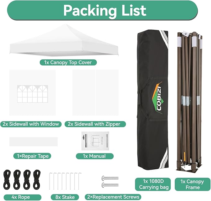 - [Included Accessories, Warranty Service] 1x Commercial Grade 10x10 Pop Up Tent Frame, 1x 420D Top Cover, 2x window sidewalls, 2x zipper door sidewall, 8x Ground Pegs, 4x Windproof Ropes, 1x Hand Bag, 1x Manual.We provide 1 year warranty service. If you have any problems and questions, please feel free to contact us, we will give you the best help. Choosing us means choosing a comfortable life.