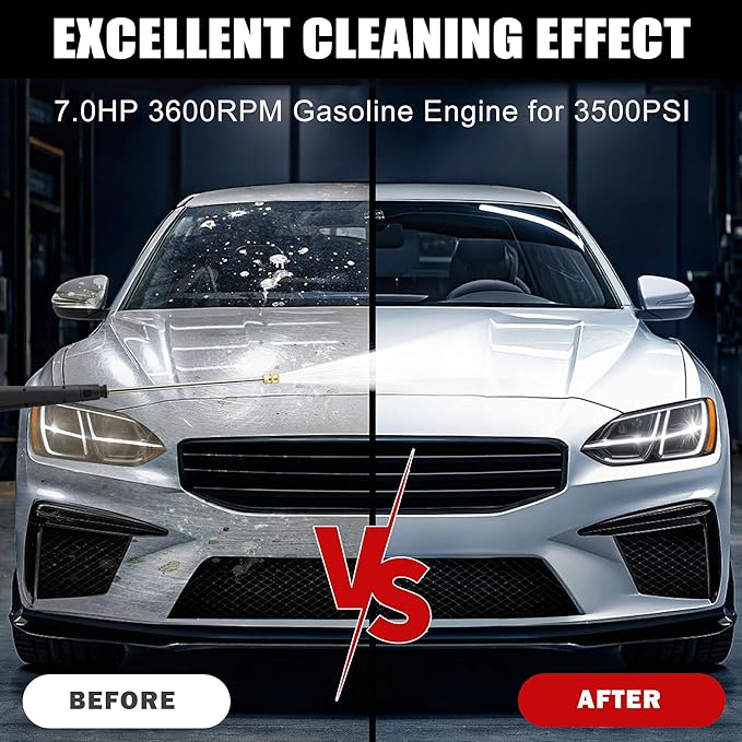 - High-Pressure Cleaning Power: Powered by a 7HP 210CC 4-stroke gasoline engine and a brass-core axial cam pump, this gas-powered pressure washer delivers up to 3950 PSI and 2.6 GPM water output. Designed to handle challenging cleaning projects such as patios, driveways, decks, and house siding with consistent performance