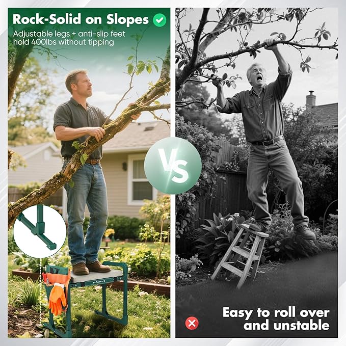 - โ ใAdjustable Legs for Uneven Terrainใ Built with extendable support legs and non-slip rubber feet, this Sakerplus kneeling chair adapts to slopes, gravel, or soft soil. Designed to help maintain stability while planting in raised beds or trimming hedges, even on uneven ground.