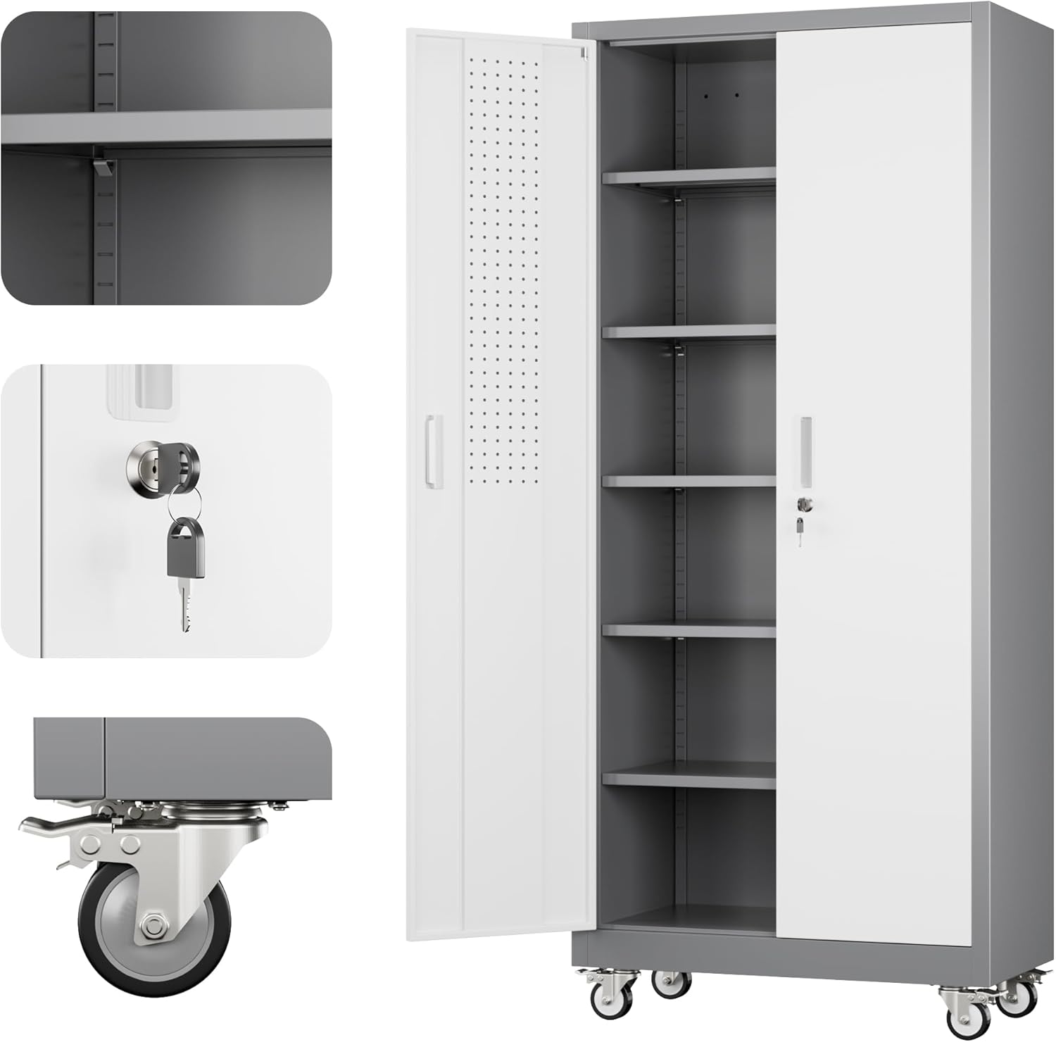 Aobabo 71" H x 32" W x 16" D Metal Storage Cabinet with Wheels, Garage Steel Storage Cabinet with 5 Adjustable Shelves and 4 Hooks for Home Office School, Assembly Required, Grey White