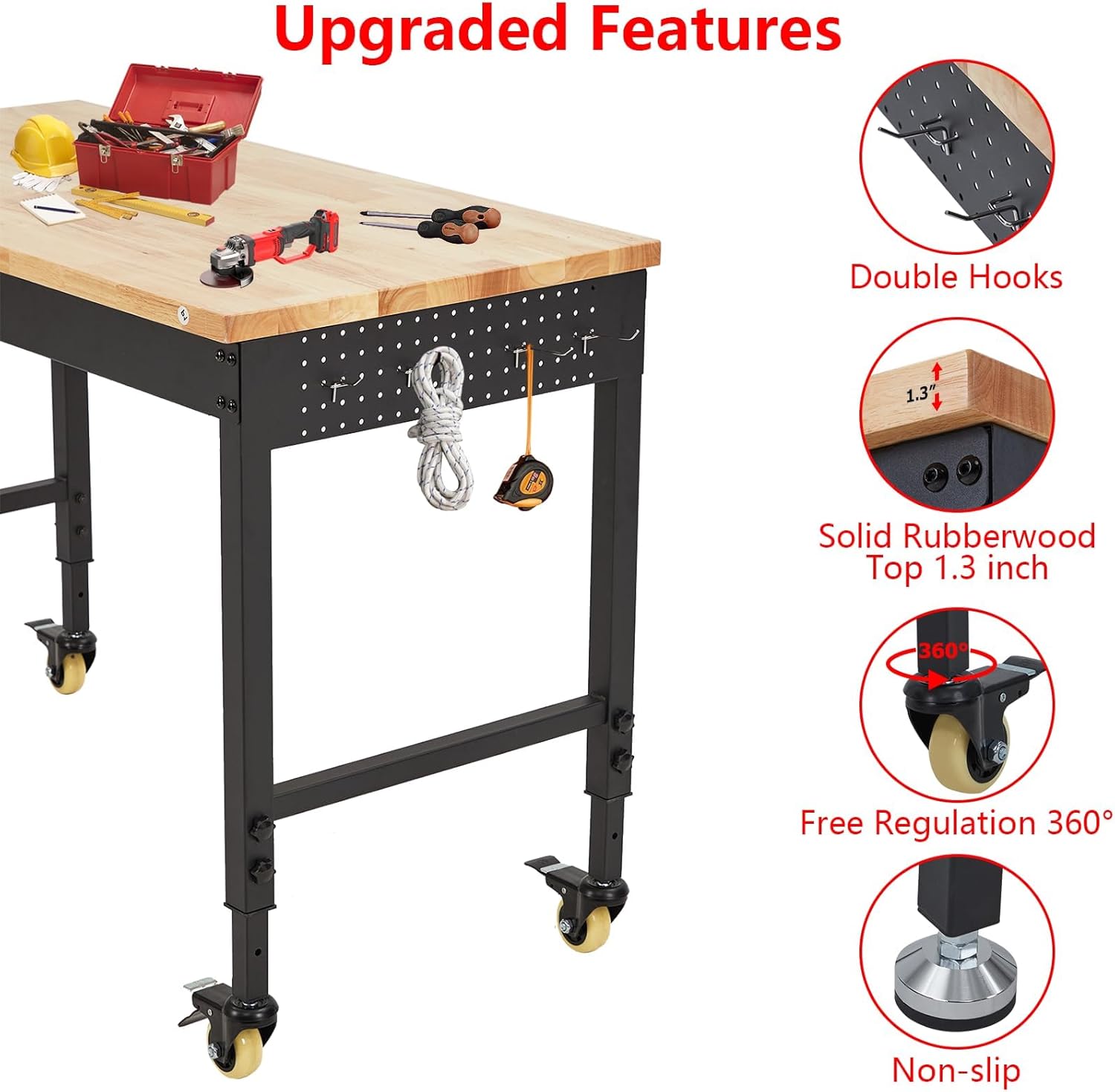48x24 Inch Heavy-Duty Adjustable Workbench with Rubber Wood Top – 2000LB Capacity Mobile Garage Workstation, Locking Wheels, Power Outlets, Ideal for Workshop, DIY & Tool Storage (Black)