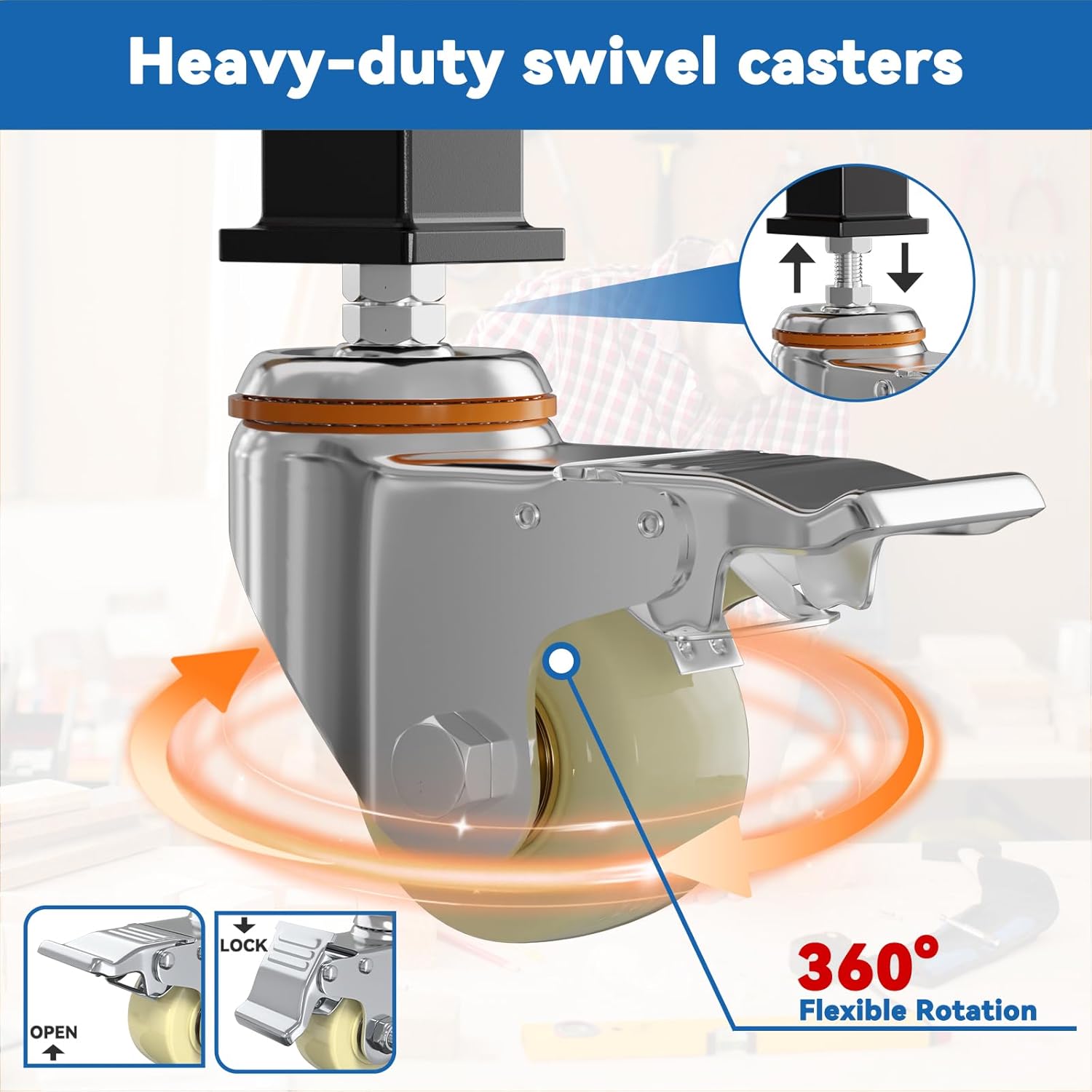 - 360ยฐ Lockable Casters for Mobility & Stability. Built for flexibility, the four heavy-duty wheels allow you to move the table effortlessly, then lock securely in place for a rock-solid working experience.