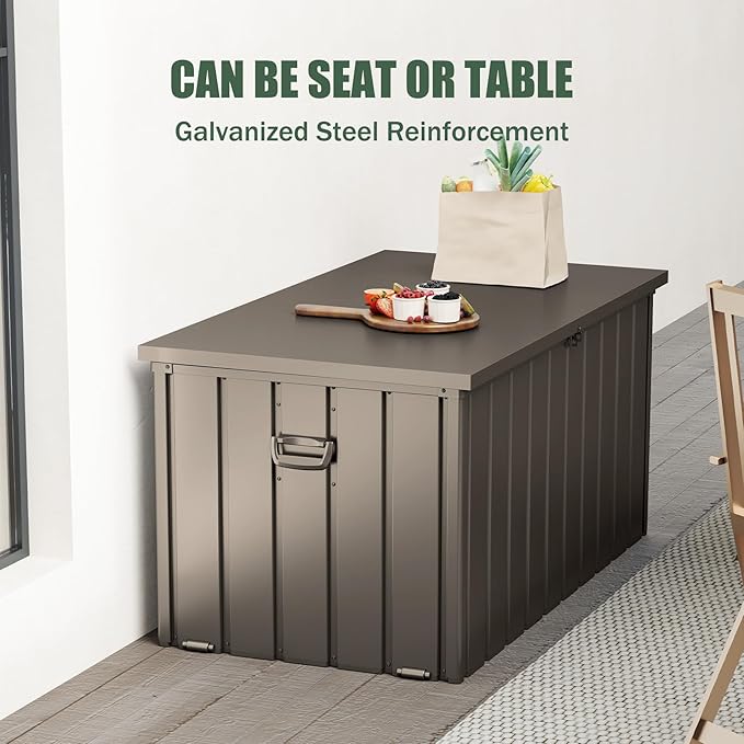 Domi Deck Box 150 Gallon, Waterproof Lockable Steel Outdoor Storage Container for Outside Cushions, Garden Tools and Pools Equipment, Brown