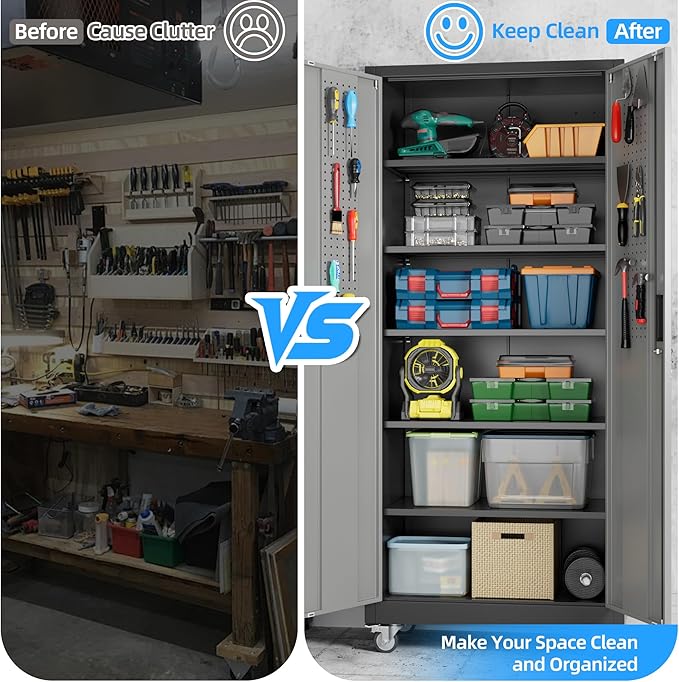 - Ample & Flexible Storage Solutions: Maximize organization with 5 adjustable shelves (customizable height) and pegboard on both doors, paired with 4 hooks for hanging tools, accessories, or gear. This design of the garage storage cabinet with wheels adapts to your needs, whether storing heavy-duty items or small essentials;