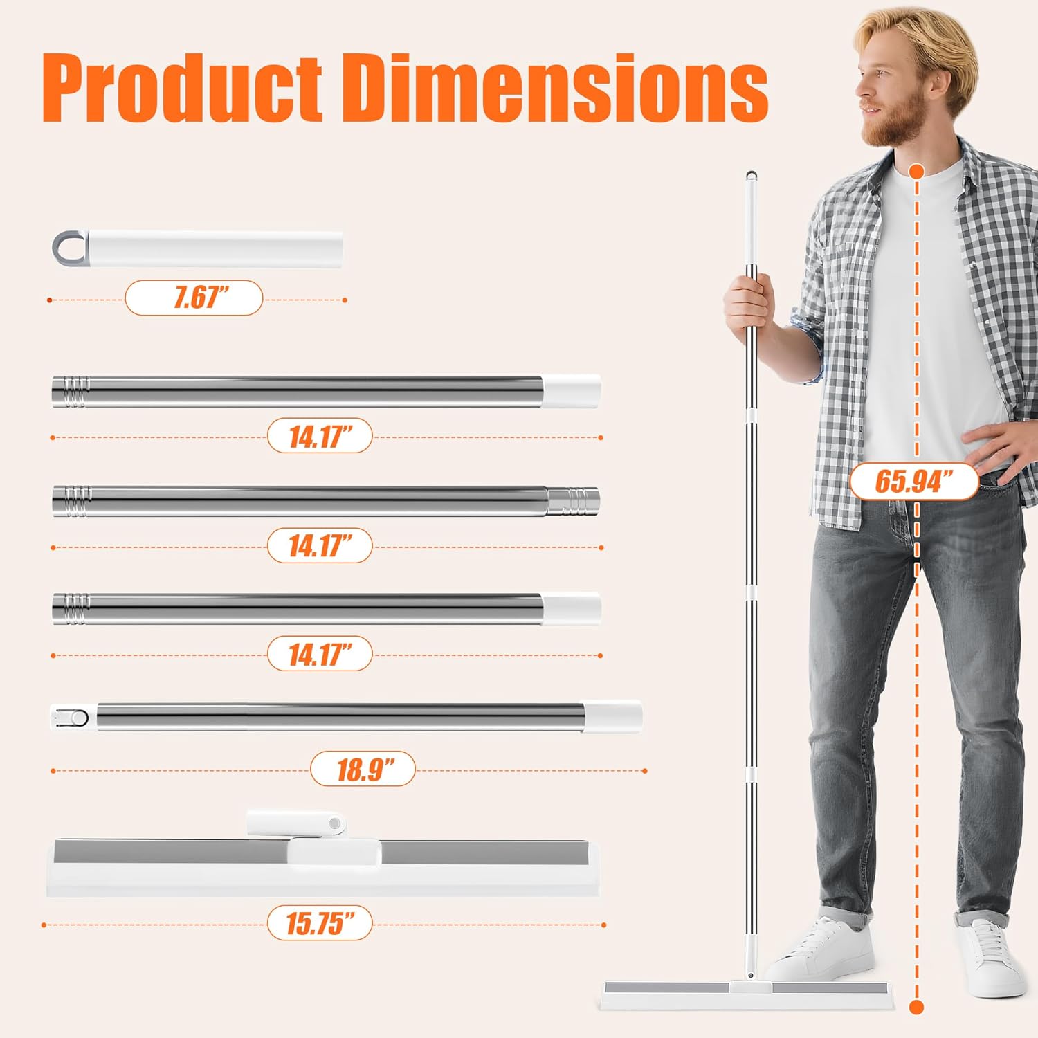 - 【Adjustable Long Handle (18"-65") – Clean Without Bending】 Telescopic handle extends from 18" to 65" for perfect reach. The 15.75" wide blade covers more surface in less time, letting you clean under furniture and across kitchens, bathrooms, or pool decks—designed for comfortable, everyday home use.