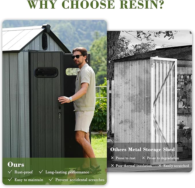 - Durable Resin Shed: Unlike conventional metal storage shed, resin sheds deliver superior environmental benefits while being rust-proof and corrosion-resistant for long-term durability. The construction eliminates sharp edges, preventing accidental scratches during use.