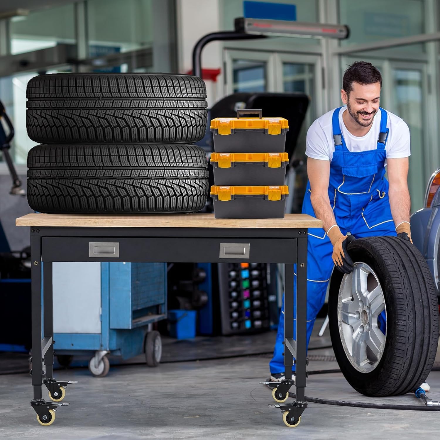48'' Adjustable Workbench, Heavy Duty Workbench with Drawer, Power Outlet and Lockable Wheels, 2000 LBS Capacity, Work Table Suitable for Office, Garage, Workshop