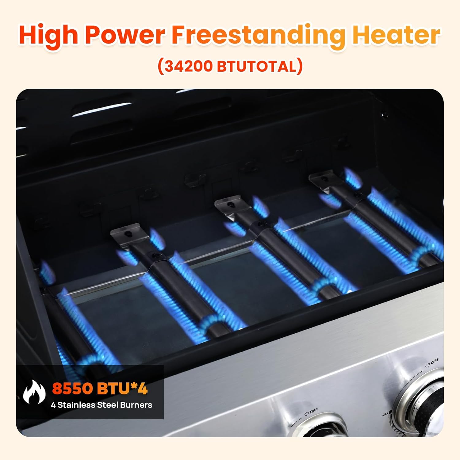 - 🔥 High-Performance Stainless Steel Burners - This propane gas grill features 4 powerful stainless steel burners delivering a total of 34,200 BTU per hour. With a built-in piezoelectric ignition system, you can enjoy instant start-up—just push and turn the control knob. It’s reliable, efficient, and ready to fire up your outdoor meals in seconds.