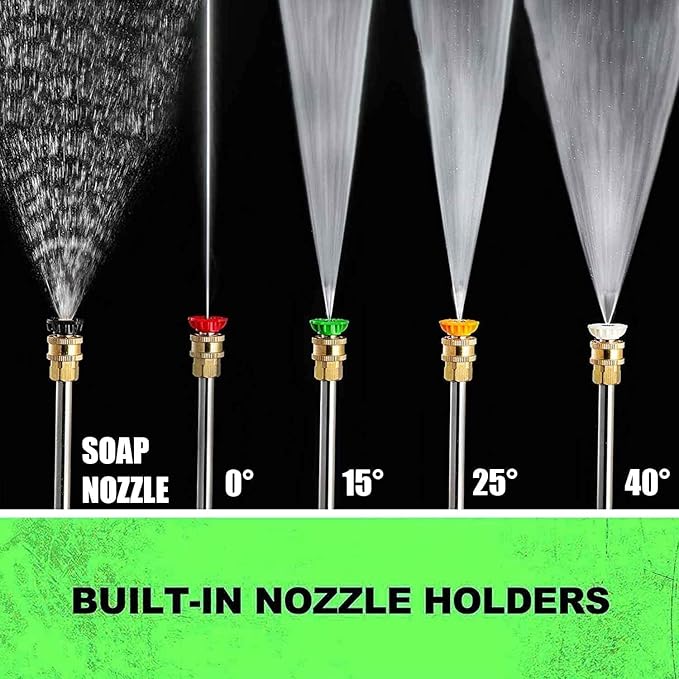 - 【𝟓 𝐑𝐞𝐩𝐥𝐚𝐜𝐞𝐚𝐛𝐥𝐞 𝐍𝐨𝐳𝐳𝐥𝐞𝐬】: This gas power washer is equipped with 4 universal nozzles with different angles: 0°, 15°, 25°, 40° and soap nozzle. You can install nozzles with different angles according to different cleaning needs. The larger the angle, the greater the water flow and the lower the pressure; the smaller the angle, the smaller the water flow and the greater the pressure.