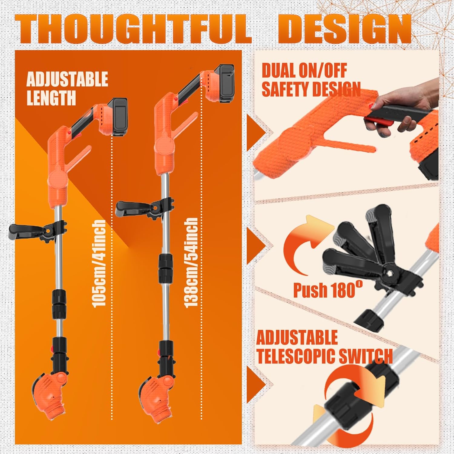 - 【Ergonomic String Trimmers Grip & Adjustable Height & Rotating Head】The battery operated weed wacker with extra labor-saving handle, you don't need to bend down. Work in the most comfortable position and greatly reduce stress on your back and waist. The adjustable telescoping pole adjusts in length from 35-55 inches to provide the length everyone needs. The no string weed wacker head angle is adjustable from 0-90°, allowing you to easily care for any hard-to-reach nooks and crannies