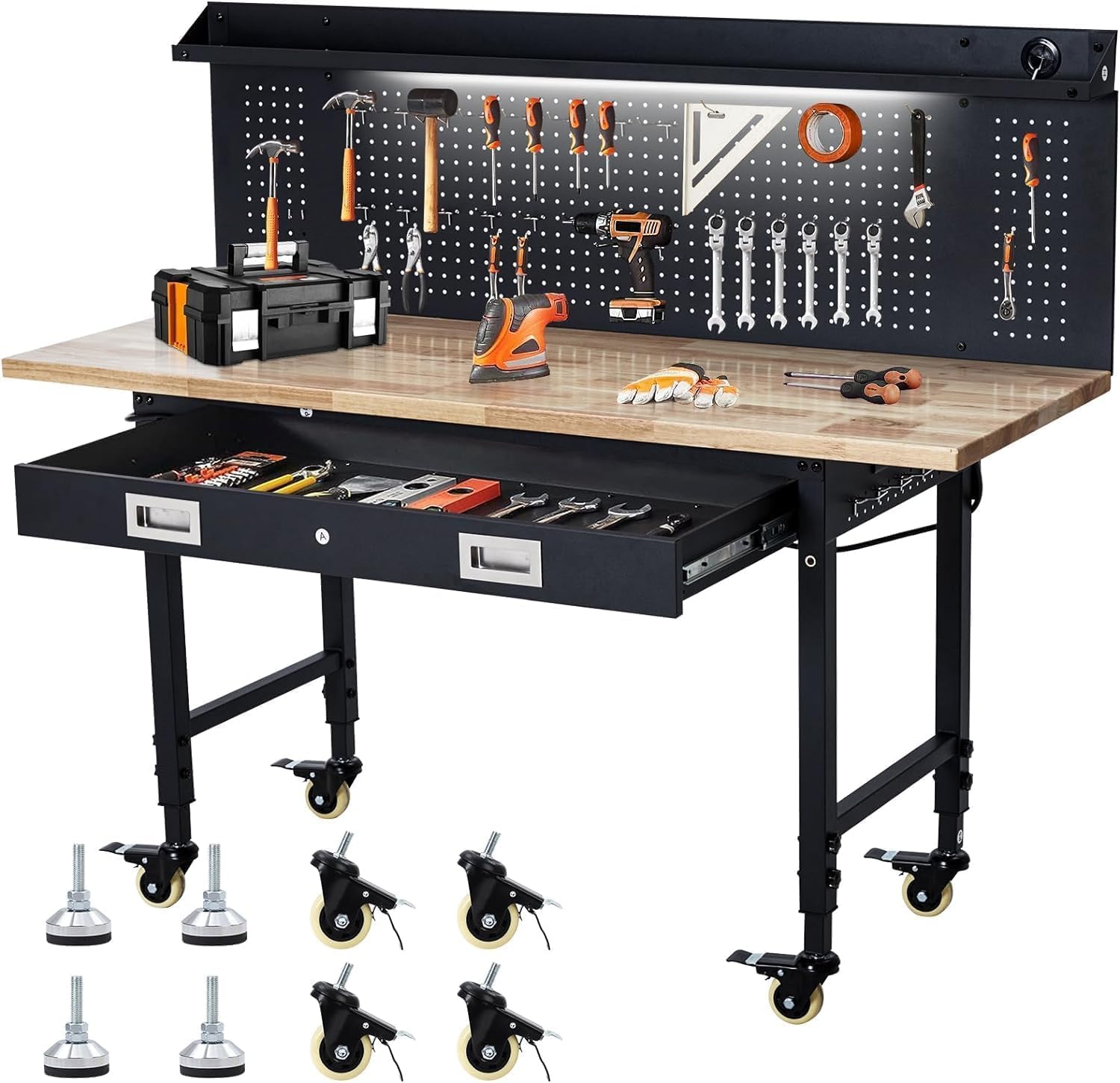 - [Full-Width Drawer & Pegboard Organization]Organize your workflow with a spacious, ball-bearing drawer for storing screws, bolts, and hand tools, plus a steel pegboard and 30 versatile hooks. Keep all your essentials within arm’s reach and your work surface clutter-free.