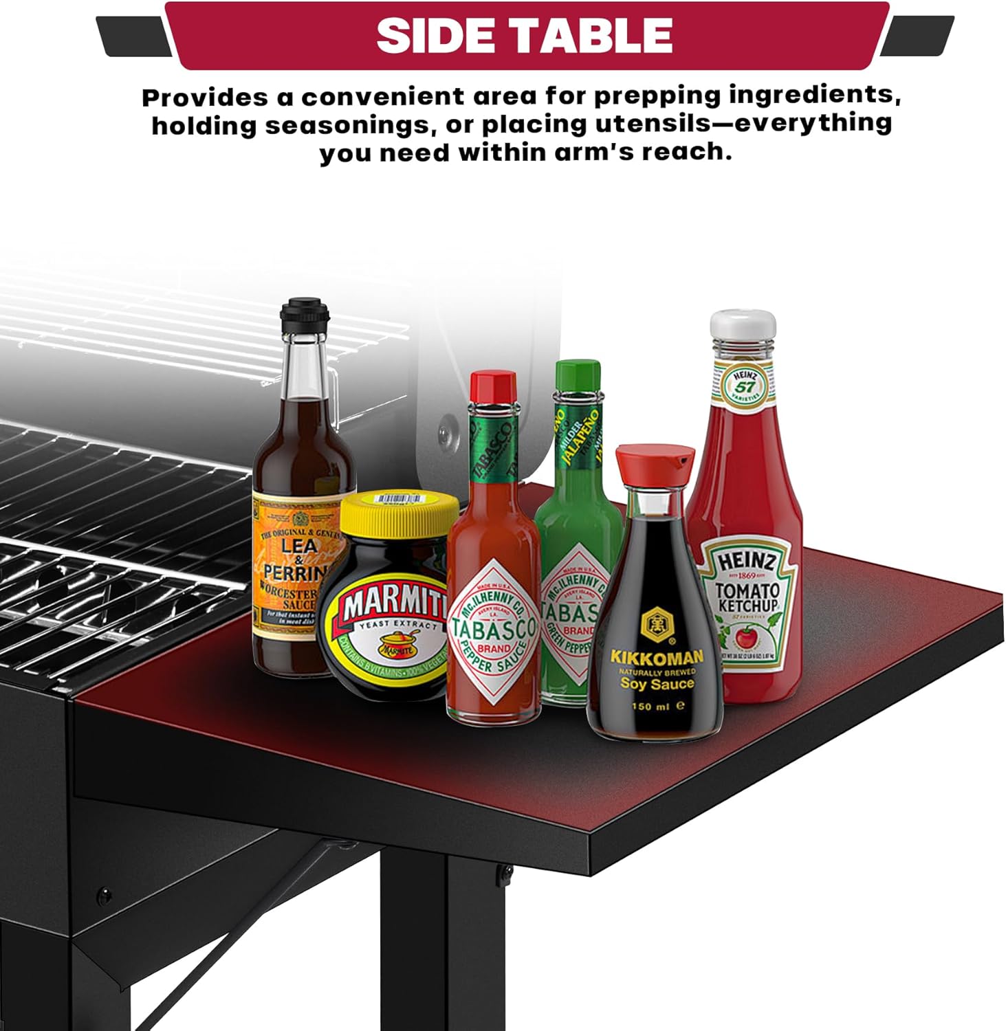 - Convenient Foldable Side Table for Prep and Serving: Equipped with a practical side table, this grill allows for easy food prep, utensil placement, or serving trays. The table folds down neatly when not in use, helping you save space and maintain a clean setup, especially when hosting in smaller outdoor areas.