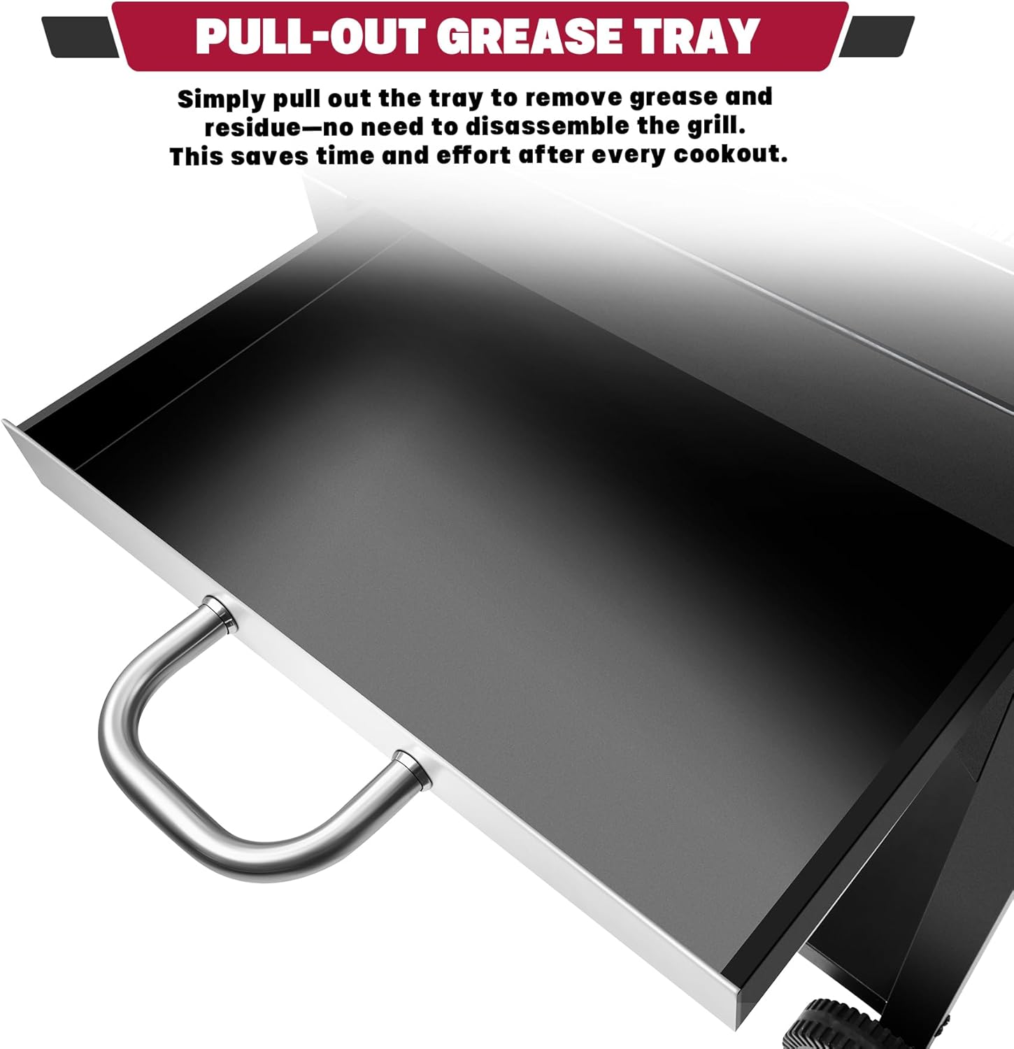 - Easy-Clean Pull-Out Grease Tray for Hassle-Free Maintenance: This charcoal grill features a convenient pull-out grease tray that catches excess oil and drippings during cooking. Designed for quick removal and easy cleaning, the tray helps reduce flare-ups, keeps your grill cleaner, and extends the life of your grill. No more tipping or awkward scrubbing—just slide it out, empty, and you're ready for your next BBQ session.