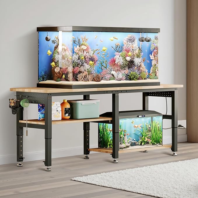 - 【Max 2000lbs Capacity & Solid Wood Top】Built with an industrial steel frame and 1.2" thick solid rubber wood top, this heavy duty workbench supports up to 2000 lbs evenly distributed—ideal for shop, garage, or office.