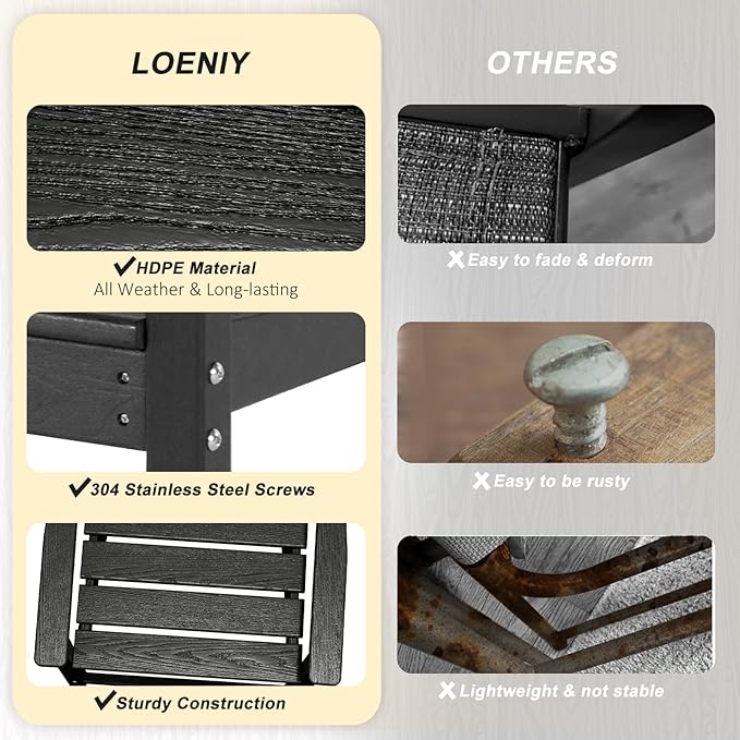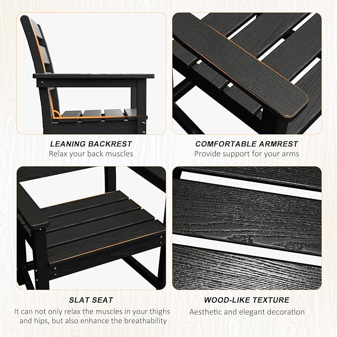 - 【All-Weather Material】Made of High-density polyethylene (HDPE) and 304 stainless steel hardware, this patio dining set is long-lasting and will not crack, scratch, rust, or fade over time. In addition, the table and chairs are designed with an elegant wood-like texture, combining both practicality and aesthetics.
